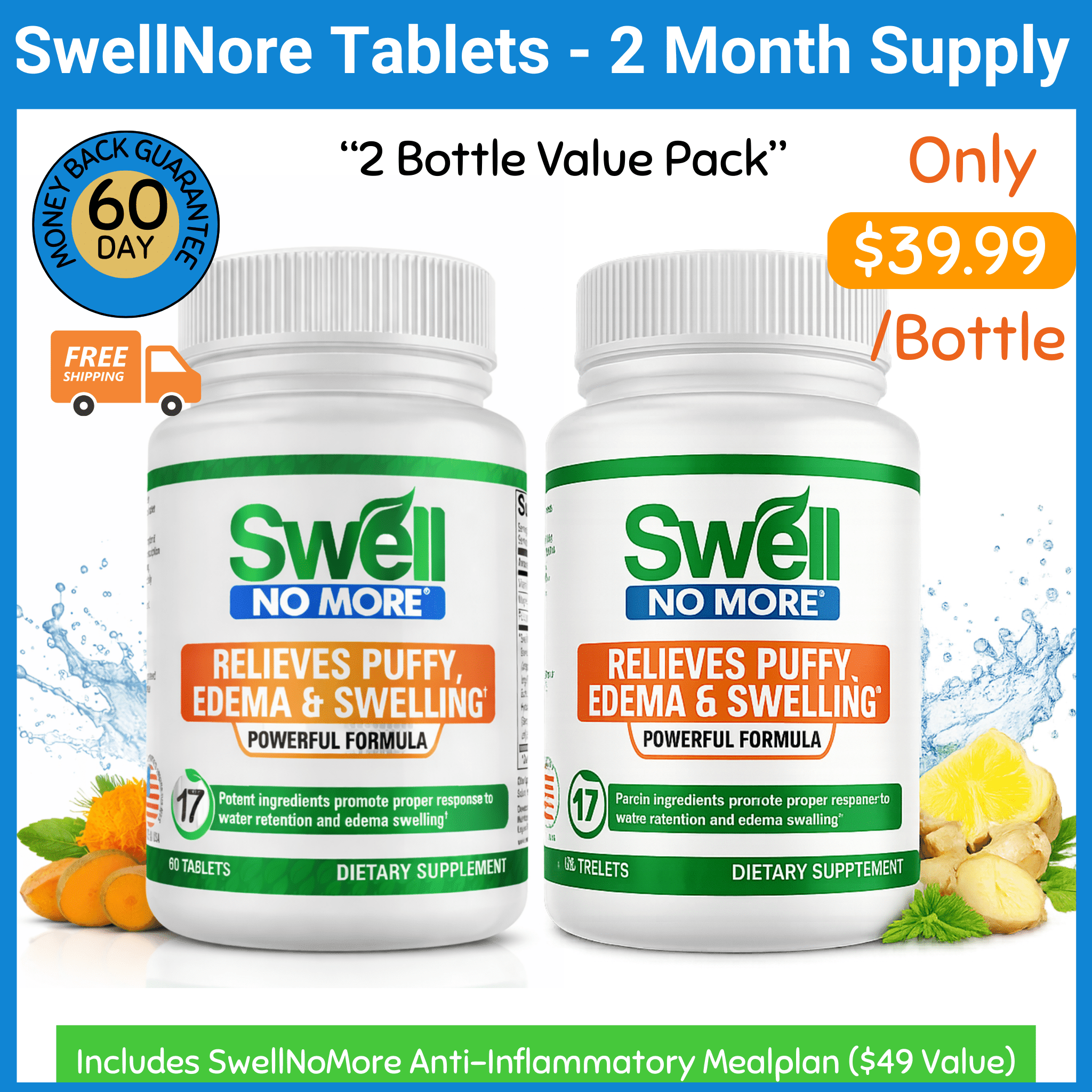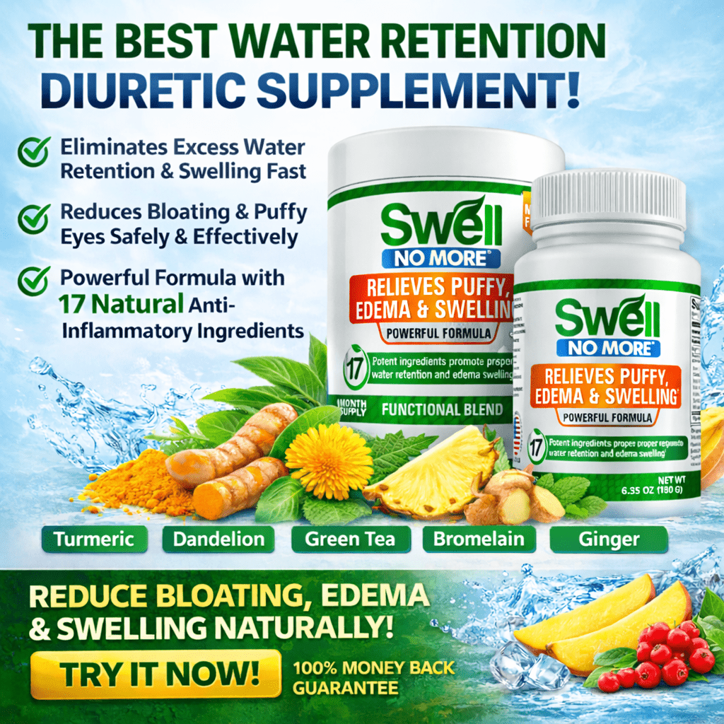 SwellNoMore® is a Natural Diuretic, Water Pill and Anti-Inflammatory Supplement with 17 Natural ingredients that reduces Water Retention, Bloating, Inflammation and Swelling (Edema) throughout the entire body. Just two supplements daily will dramatically reduce puffiness, bloating and swelling, including swollen legs, swollen ankles, swollen feet, puffy eyes. puffy face and other types of edema & swelling within days. (Individual results may vary.)