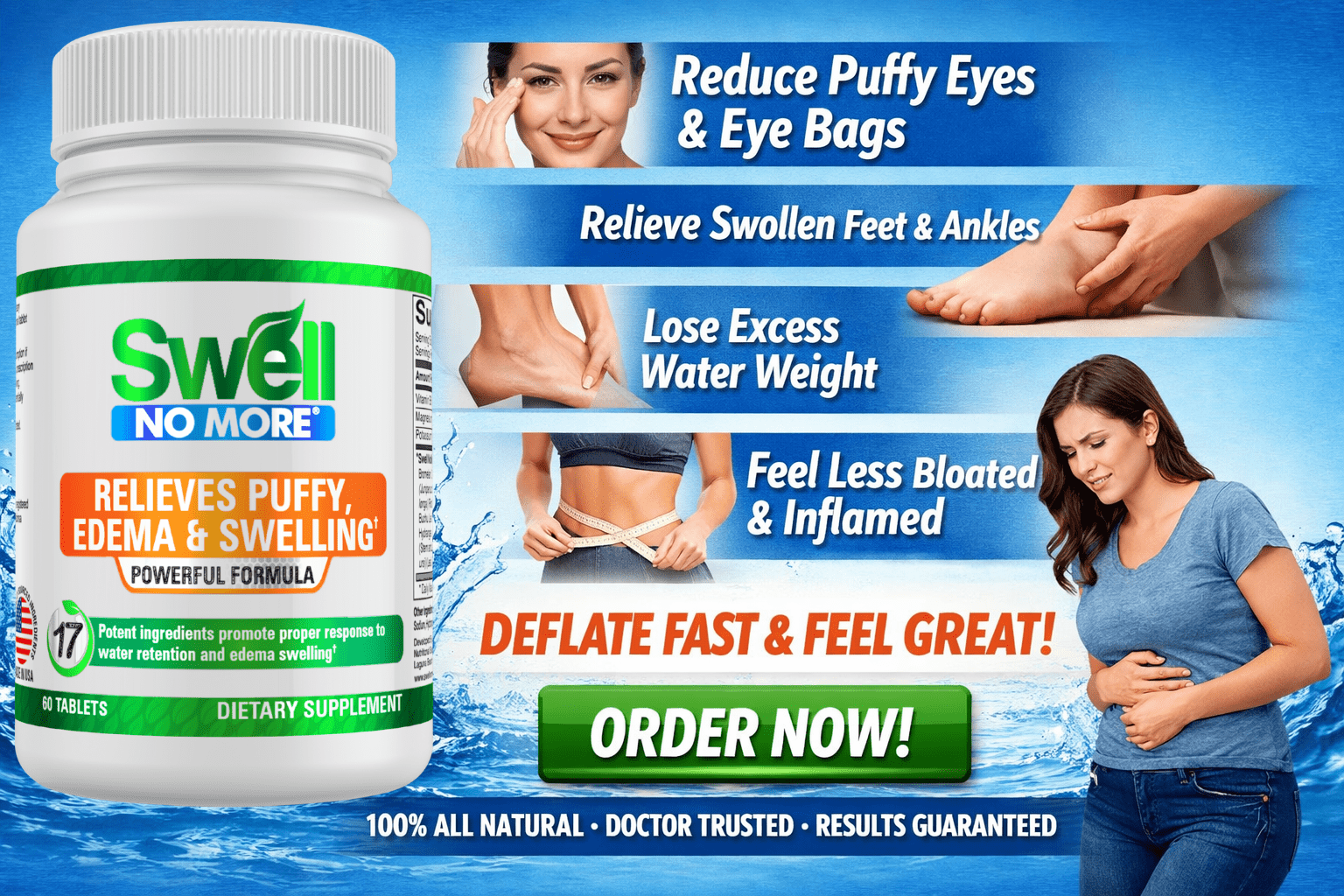 SwellNoMore is The Best Natural Supplement To Reduce Swollen Feet, Swollen Legs, Swollen Ankles, Puffy Eyes & Other Types of Fluid Retention, Puffiness, Bloating, Edema and Swelling.